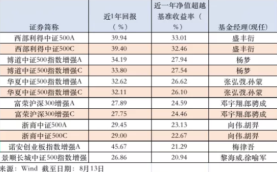 Wind数据显示,截至8月13日,在可统计收益的189只(A/C份额分开统计)指数增强基金中,近一年收益排名前三的是诺安创业板指数增强A、西部利得中证500A、西部利得中证500C,分别获得45.67 %、39.94 %、39.40 %的回报。此外,景顺长城创业板综指、博道中证500指数增强A/C、华夏中证500指数增强A/C近1年回报也均在30 %以上。
